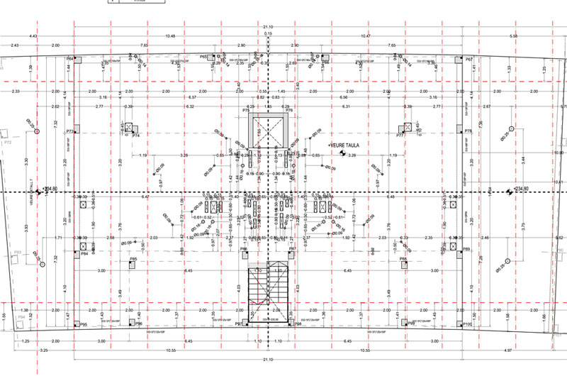 Con frecuencia faltan cotas de algún pilar, reservas en forjados, o bien cotas de límites de forjado. A veces, si la geometría es complicada, conviene acotar ángulos o bien establecer unos ejes auxiliares de acotación con una cierta frecuencia para acotar posteriormente la distancia de la intersección con estos ejes virtuales.